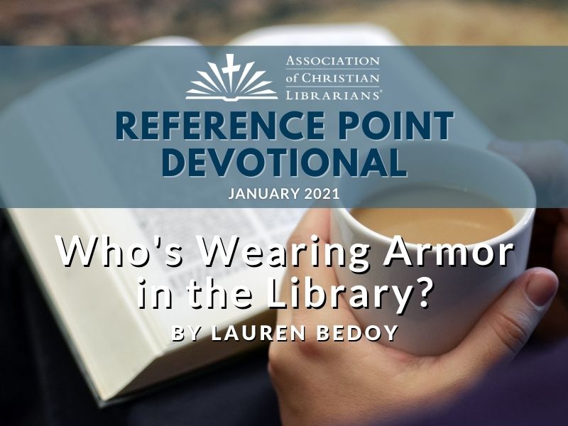 Libraries are usually such peaceful places; it is hard to imagine that a “war” may be going on inside them. Yet internal battles are being fought all the time in the hearts of students, staff, and faculty. Paul encourages us in Ephesians to put on the whole armor of God so we can stand when trouble comes. It does not say to put on this piece or that piece, or whichever pieces we feel like, but rather the whole armor. If we wear the helmet of salvation but forget the sword of the Spirit (the Word of God), we won’t be able to stand. If we put on the belt of truth but forget about the breastplate of Christ’s righteousness, we won’t be able to stand. If we put on the shoes of the gospel of peace but forget about the shield of faith, we won’t be able to stand. We have to take up the whole armor and be ready for action!
