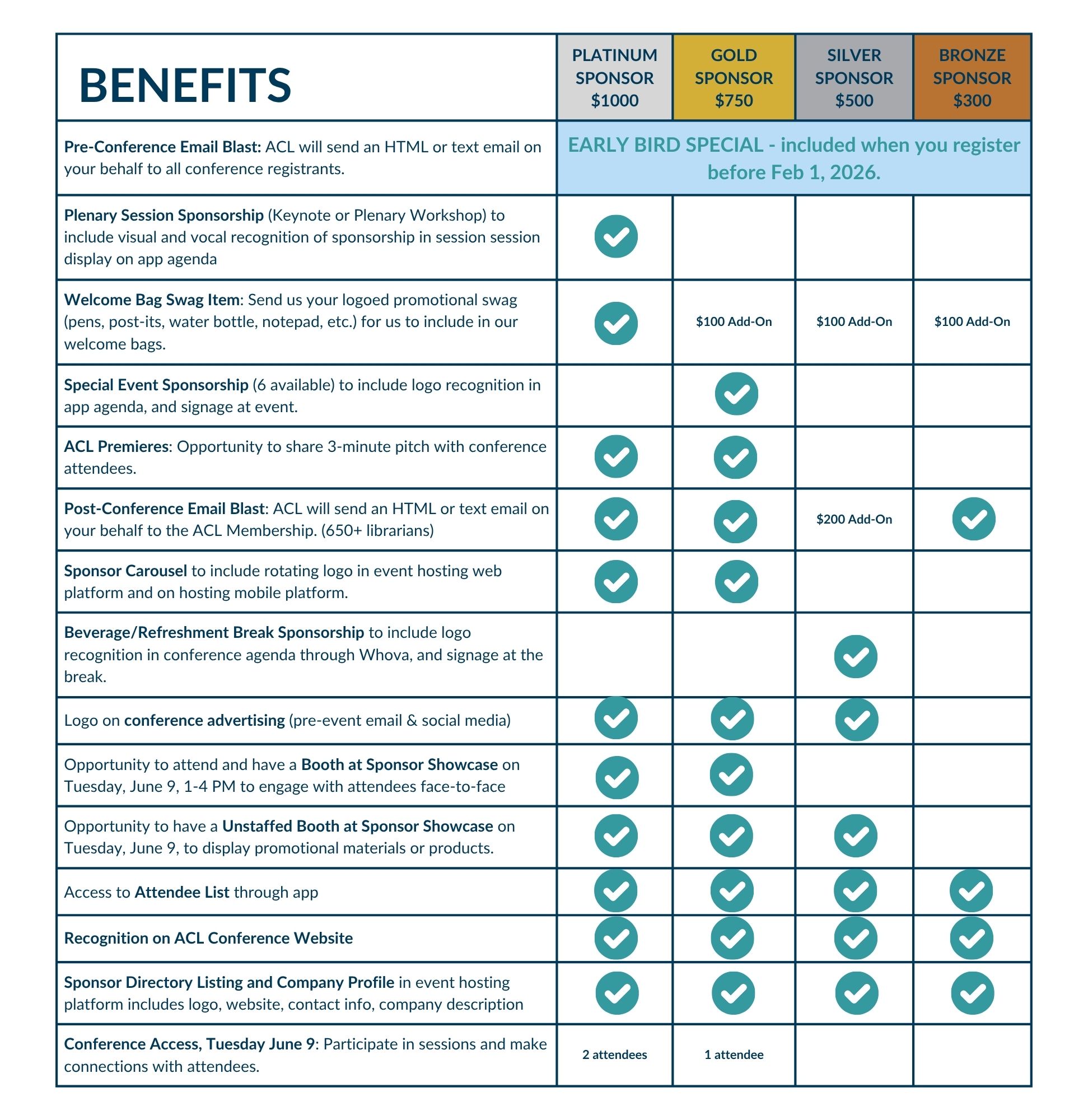 Join us in making the 2026 ACL Annual Conference an unforgettable experience for librarians and sponsors alike!